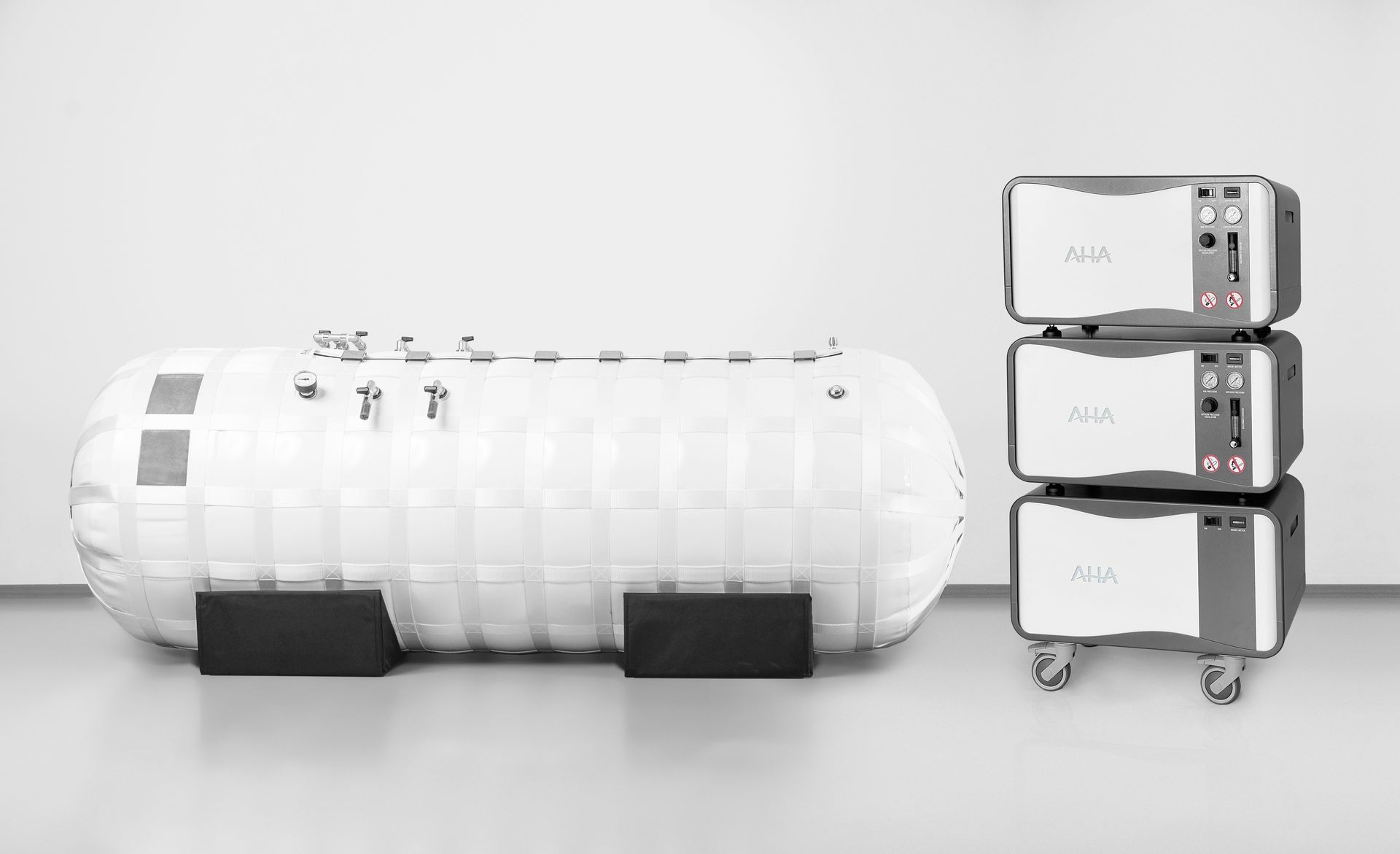 Hiperbarična komora AHA Fit je bila strogo testirana in certificirana za uporabo s 100 % kisikom, kar pomeni, da jo je mogoče uporabljati s katerim koli virom kisika, vključno s kisikovimi rezervoarji ali bolnišničnimi kisikovimi napravami. Da bi zagotovili preprosto delovanje, priporočamo uporabo visoko zmogljivih koncentratorjev kisika AHA.